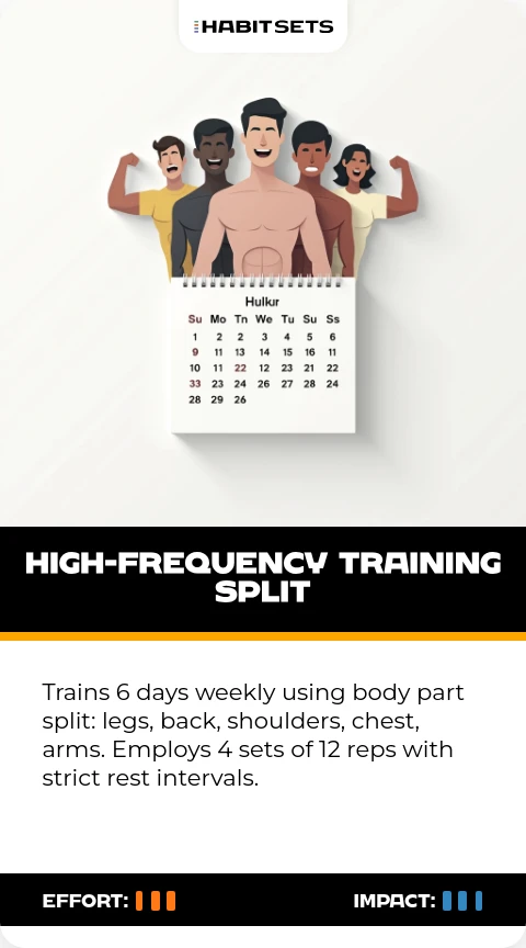Trains 6 days weekly using body part split: legs, back, shoulders, chest, arms. Employs 4 sets of 12 reps with strict rest intervals.