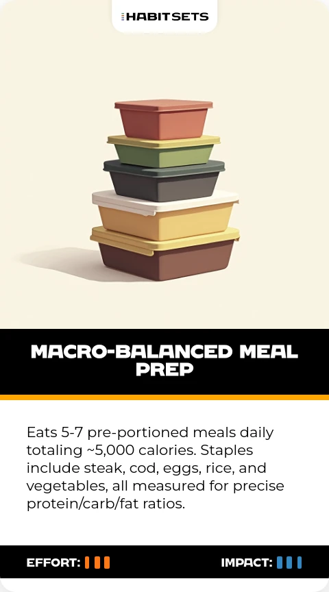 Eats 5-7 pre-portioned meals daily totaling ~5,000 calories. Staples include steak, cod, eggs, rice, and vegetables, all measured for precise protein/carb/fat ratios.