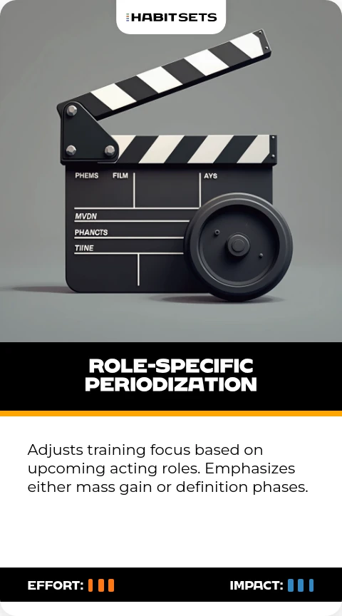 Adjusts training focus based on upcoming acting roles. Emphasizes either mass gain or definition phases.