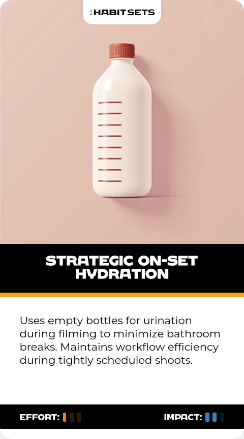 Uses empty bottles for urination during filming to minimize bathroom breaks. Maintains workflow efficiency during tightly scheduled shoots.