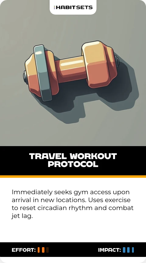 Immediately seeks gym access upon arrival in new locations. Uses exercise to reset circadian rhythm and combat jet lag.