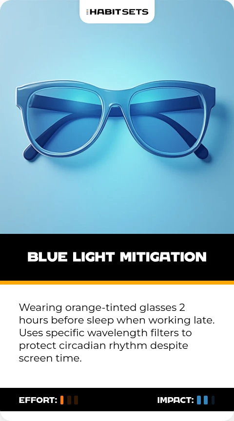 Wearing orange-tinted glasses 2 hours before sleep when working late. Uses specific wavelength filters to protect circadian rhythm despite screen time.