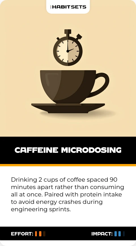 Drinking 2 cups of coffee spaced 90 minutes apart rather than consuming all at once. Paired with protein intake to avoid energy crashes during engineering sprints.