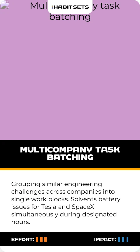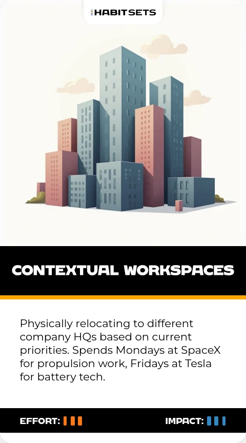 This habit leverages Musk's unique position across industries. Solutions developed for car batteries get adapted for Mars habitats within the same cognitive session.