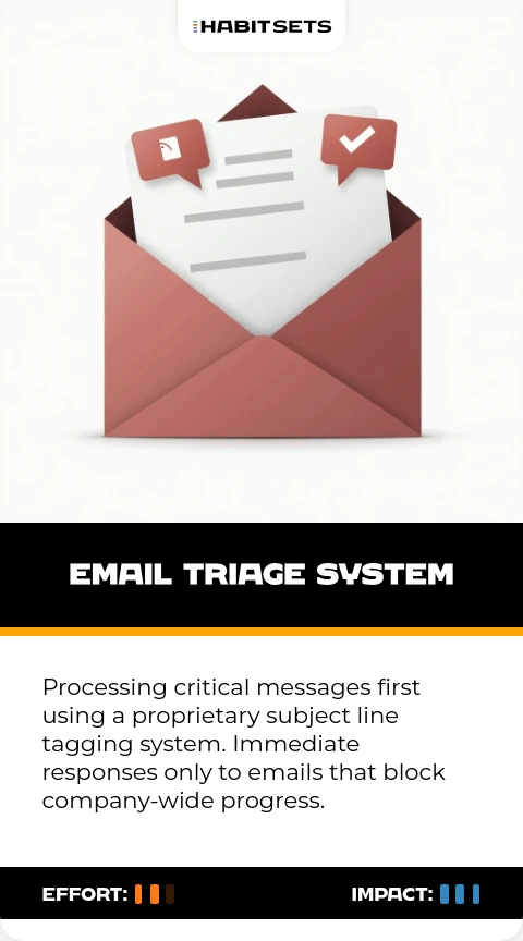 Processing critical messages first using a proprietary subject line tagging system. Immediate responses only to emails that block company-wide progress.
