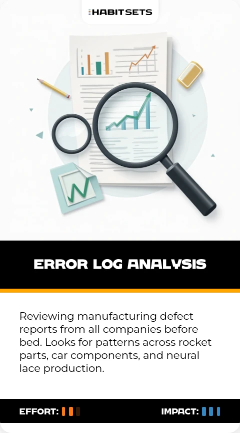 Musk believes night-time review allows subconscious problem-solving. Many production line improvements reportedly emerged from this cross-industry error analysis.