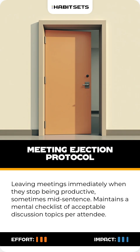 Leaving meetings immediately when they stop being productive, sometimes mid-sentence. Maintains a mental checklist of acceptable discussion topics per attendee.