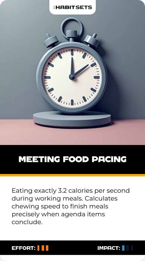 Eating exactly 3.2 calories per second during working meals. Calculates chewing speed to finish meals precisely when agenda items conclude.
