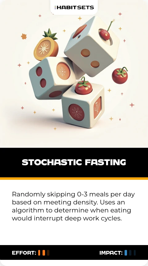 Randomly skipping 0-3 meals per day based on meeting density. Uses an algorithm to determine when eating would interrupt deep work cycles.