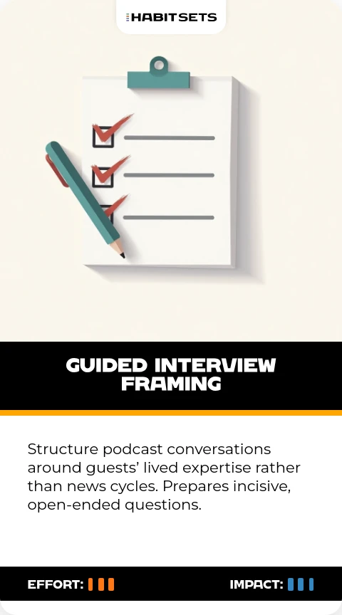 Structure podcast conversations around guests’ lived expertise rather than news cycles. Prepares incisive, open-ended questions.