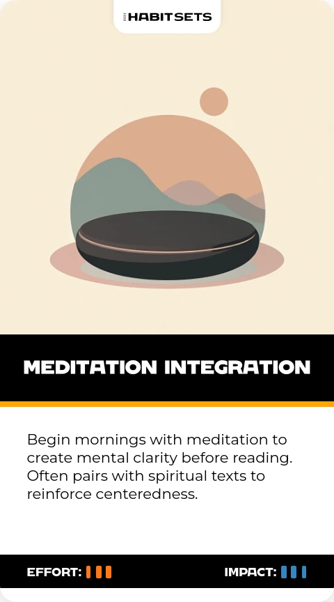 Begin mornings with meditation to create mental clarity before reading. Often pairs with spiritual texts to reinforce centeredness.