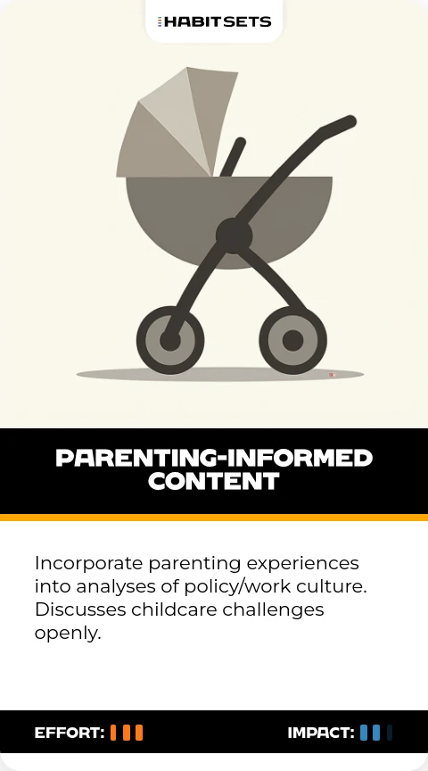 Incorporate parenting experiences into analyses of policy/work culture. Discusses childcare challenges openly.