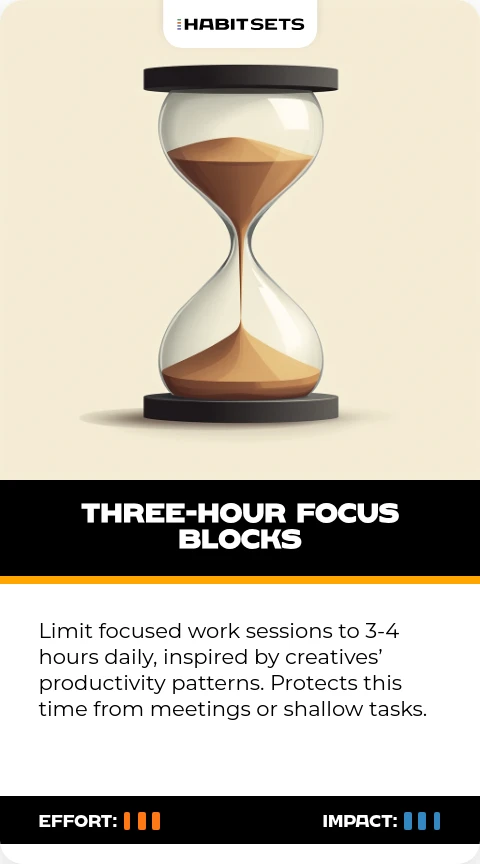 Limit focused work sessions to 3-4 hours daily, inspired by creatives’ productivity patterns. Protects this time from meetings or shallow tasks.