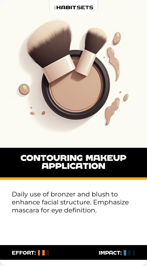 Daily use of bronzer and blush to enhance facial structure. Emphasize mascara for eye definition.