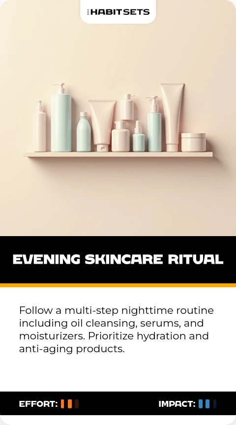 Follow a multi-step nighttime routine including oil cleansing, serums, and moisturizers. Prioritize hydration and anti-aging products.