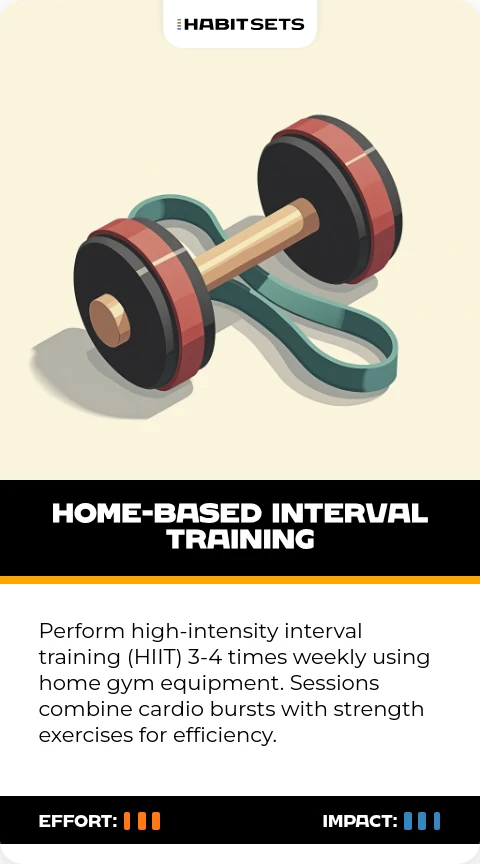 Perform high-intensity interval training (HIIT) 3-4 times weekly using home gym equipment. Sessions combine cardio bursts with strength exercises for efficiency.