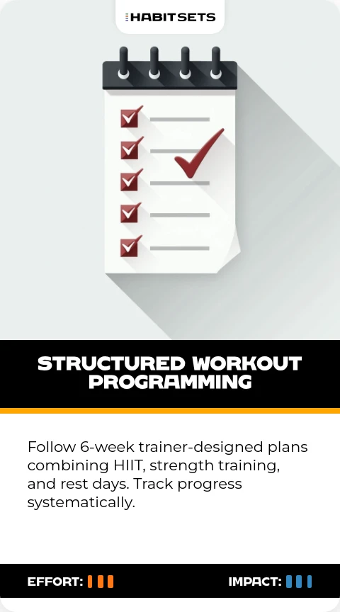 Follow 6-week trainer-designed plans combining HIIT, strength training, and rest days. Track progress systematically.