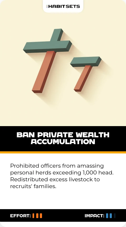 Prohibited officers from amassing personal herds exceeding 1,000 head. Redistributed excess livestock to recruits' families.