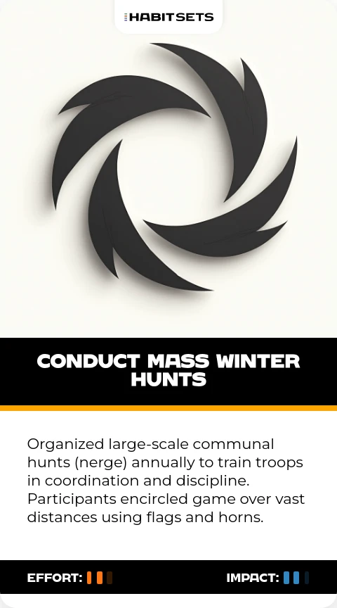 Organized large-scale communal hunts (nerge) annually to train troops in coordination and discipline. Participants encircled game over vast distances using flags and horns.
