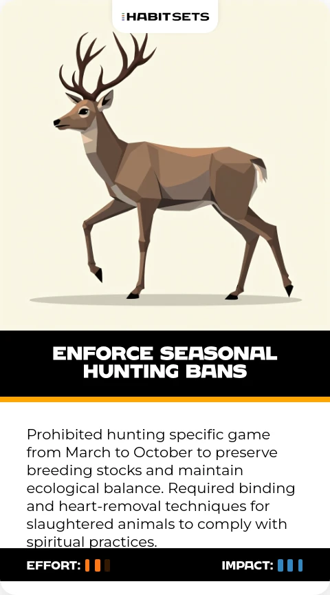 Prohibited hunting specific game from March to October to preserve breeding stocks and maintain ecological balance. Required binding and heart-removal techniques for slaughtered animals to comply with spiritual practices.