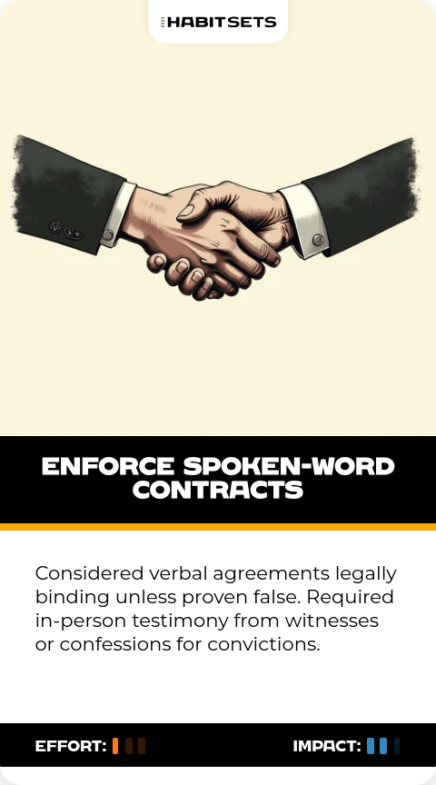 Considered verbal agreements legally binding unless proven false. Required in-person testimony from witnesses or confessions for convictions.