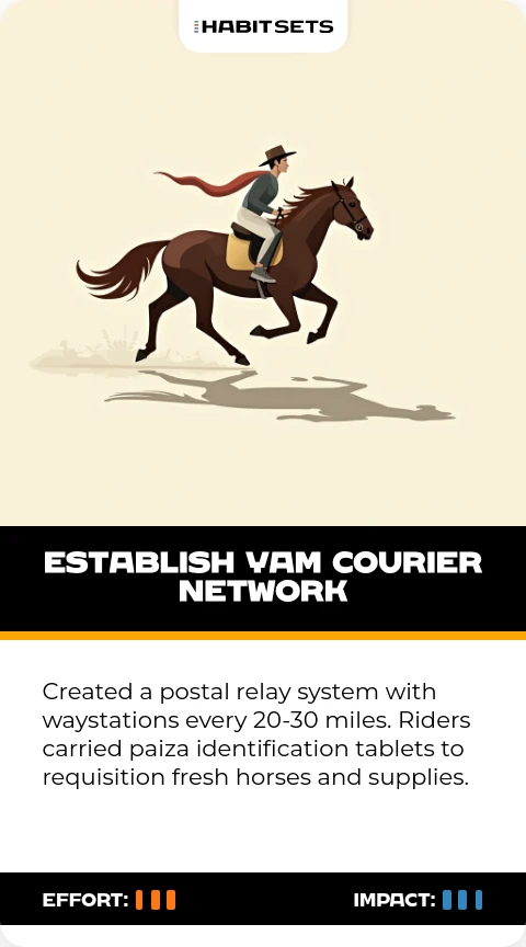 Genghis Khan needed rapid intelligence sharing across his empire. The Yam allowed him to coordinate military campaigns and monitor regional governors[5][6].