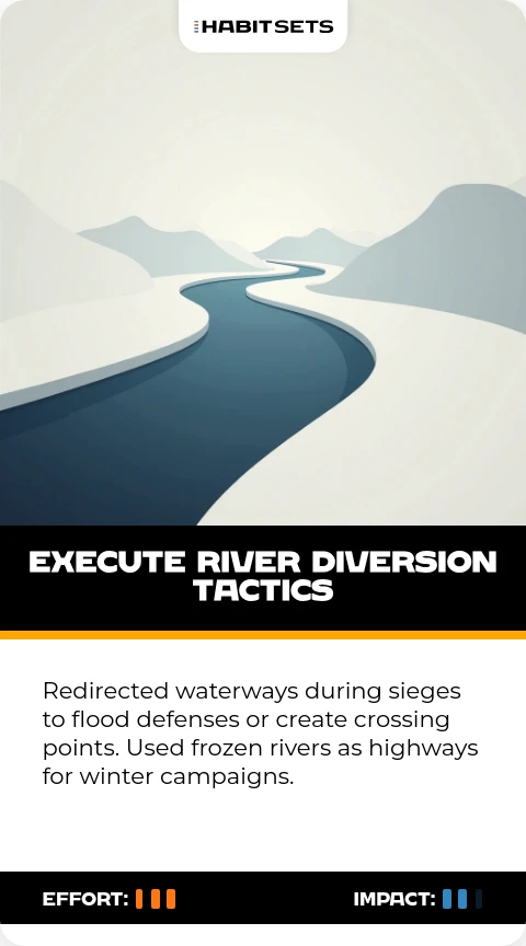 Redirected waterways during sieges to flood defenses or create crossing points. Used frozen rivers as highways for winter campaigns.