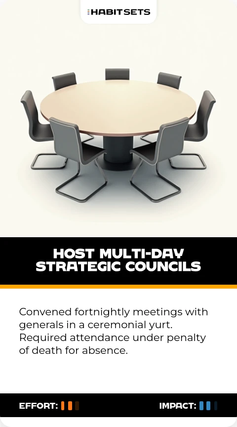 Convened fortnightly meetings with generals in a ceremonial yurt. Required attendance under penalty of death for absence.