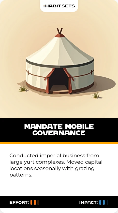 Genghis Khan maintained nomadic traditions to stay connected with troops. Mobile habits prevented bureaucratic stagnation[6][8].