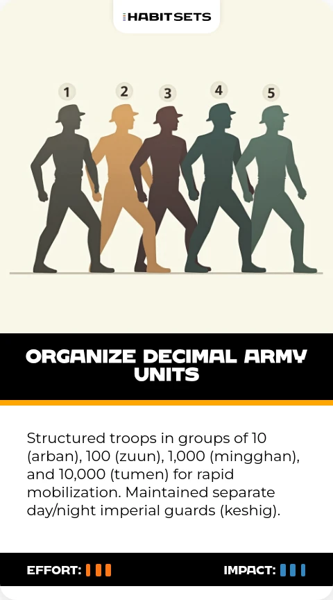 Structured troops in groups of 10 (arban), 100 (zuun), 1,000 (mingghan), and 10,000 (tumen) for rapid mobilization. Maintained separate day/night imperial guards (keshig).
