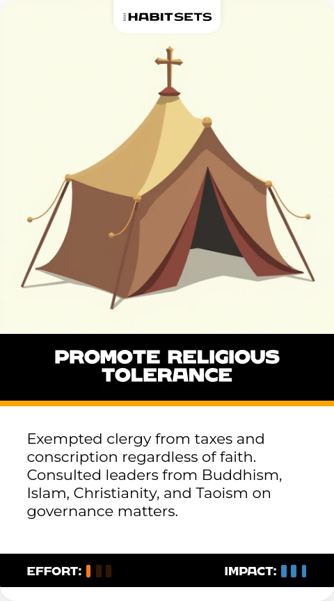 Exempted clergy from taxes and conscription regardless of faith. Consulted leaders from Buddhism, Islam, Christianity, and Taoism on governance matters.