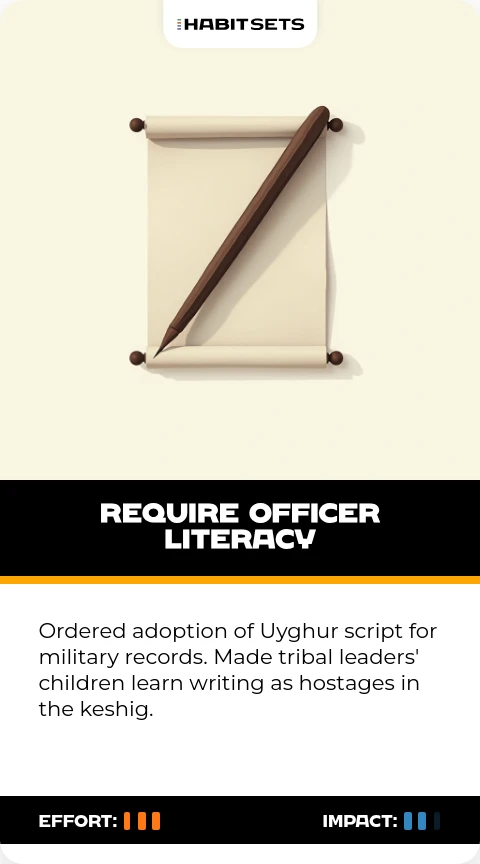 Ordered adoption of Uyghur script for military records. Made tribal leaders' children learn writing as hostages in the keshig.