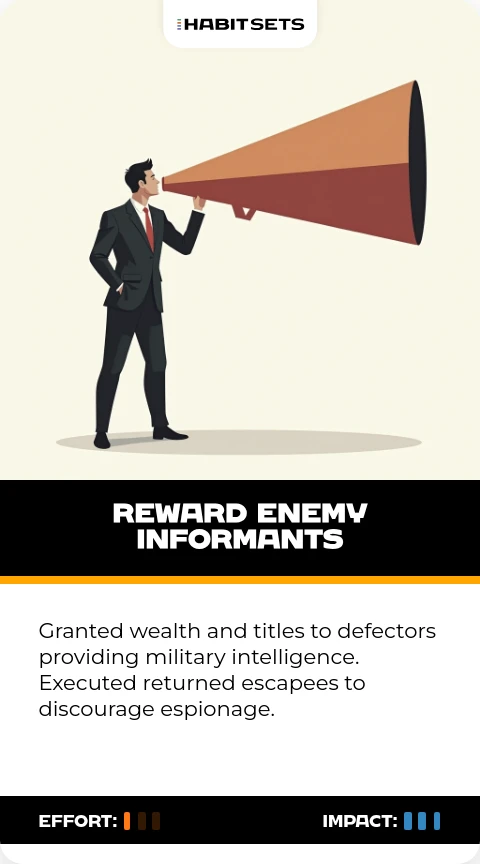 Granted wealth and titles to defectors providing military intelligence. Executed returned escapees to discourage espionage.