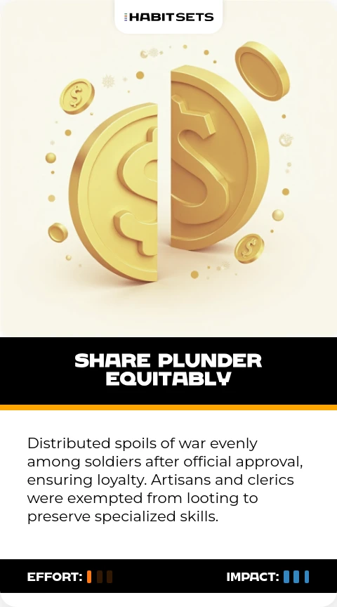 Genghis Khan prevented economic disparities that could fuel rebellions. This habit maintained troop morale and loyalty[1][3].
