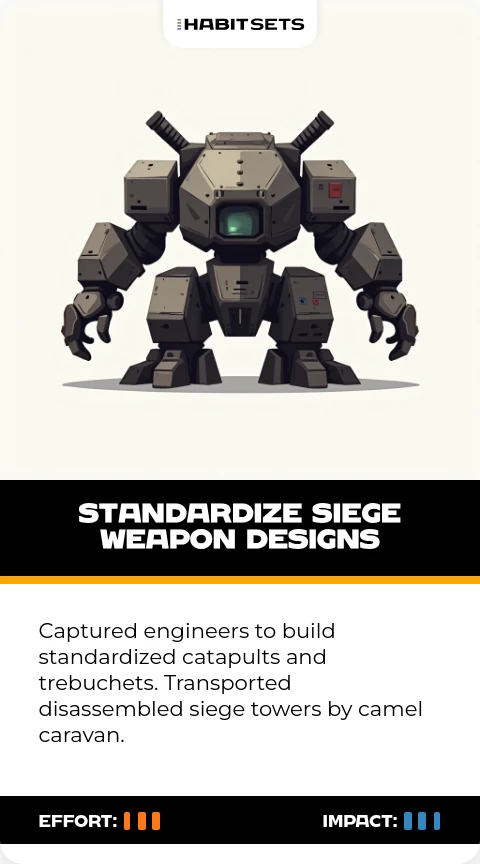 Captured engineers to build standardized catapults and trebuchets. Transported disassembled siege towers by camel caravan.