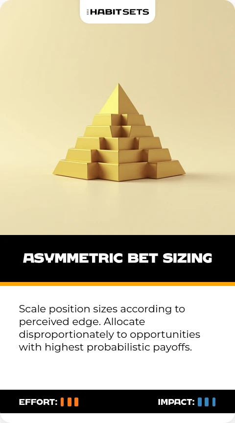 - Size Bets Asymmetrically: Asymmetric Bet Sizing. Scale position sizes according to your perceived edge, allocating disproportionately to opportunities with the highest potential payoffs.