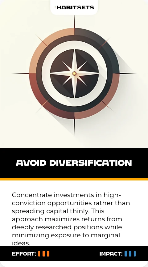 Concentrate investments in high-conviction opportunities rather than spreading capital thinly. This approach maximizes returns from deeply researched positions while minimizing exposure to marginal ideas.
