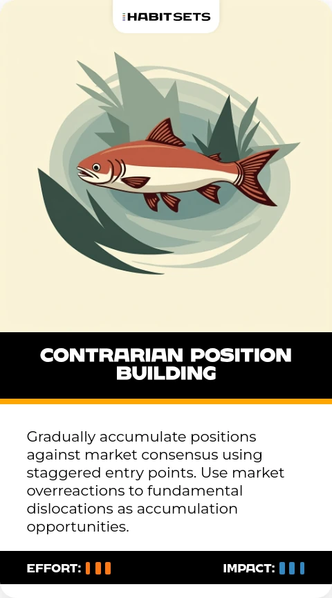 Gradually accumulate positions against market consensus using staggered entry points. Use market overreactions to fundamental dislocations as accumulation opportunities.