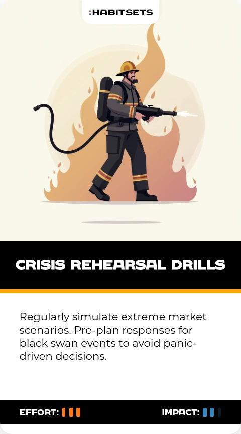- Prepare for the Unexpected: Crisis Rehearsal Drills. Simulate extreme scenarios to pre-plan responses, ensuring rational action during black swan events and market turmoil.