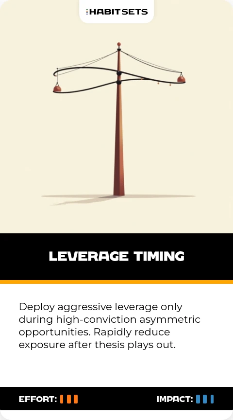 - Time Leverage Prudently: Leverage Timing. Deploy leverage aggressively only during high-conviction, asymmetric opportunities, and reduce exposure swiftly as theses play out.