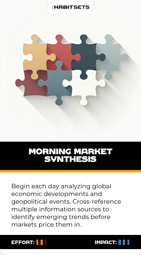 Soros' early morning research sessions feed his reflexivity theory - understanding how narratives shape market fundamentals. This habit helped him anticipate events like the 1992 Black Wednesday pound crash weeks in advance.