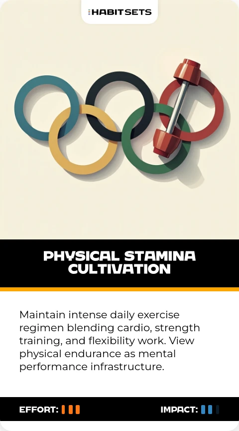 Maintain intense daily exercise regimen blending cardio, strength training, and flexibility work. View physical endurance as mental performance infrastructure.