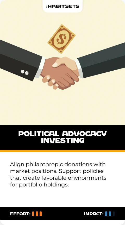 Align philanthropic donations with market positions. Support policies that create favorable environments for portfolio holdings.