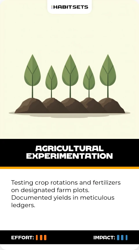 Testing crop rotations and fertilizers on designated farm plots. Documented yields in meticulous ledgers.