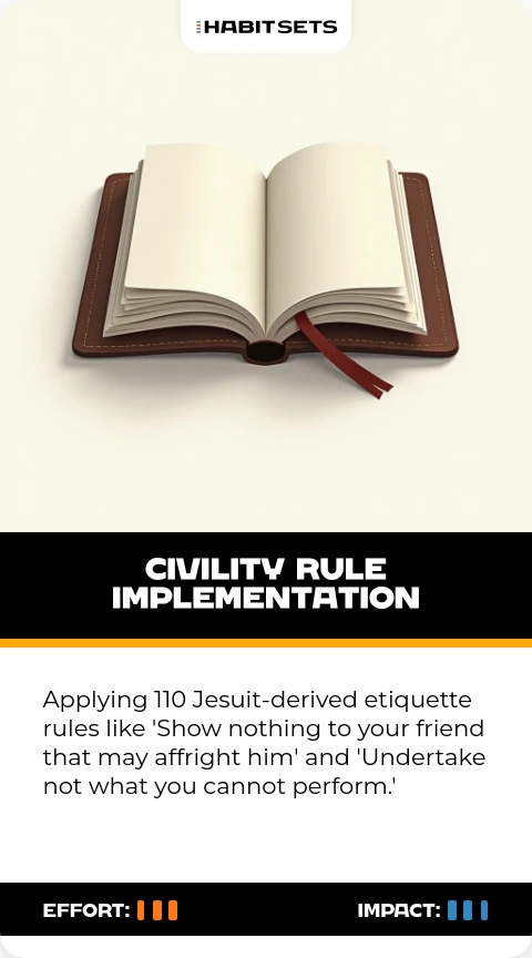 Applying 110 Jesuit-derived etiquette rules like 'Show nothing to your friend that may affright him' and 'Undertake not what you cannot perform.'