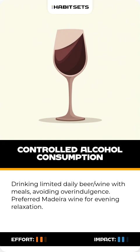 Drinking limited daily beer/wine with meals, avoiding overindulgence. Preferred Madeira wine for evening relaxation.