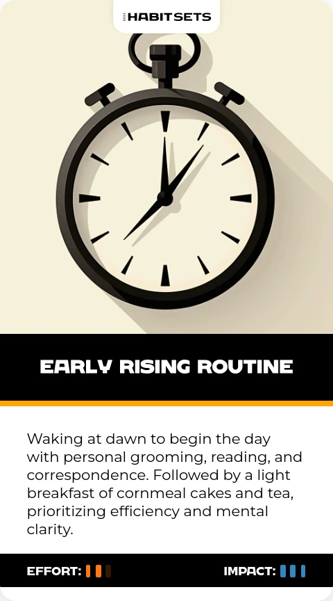 Waking at dawn to begin the day with personal grooming, reading, and correspondence. Followed by a light breakfast of cornmeal cakes and tea, prioritizing efficiency and mental clarity.