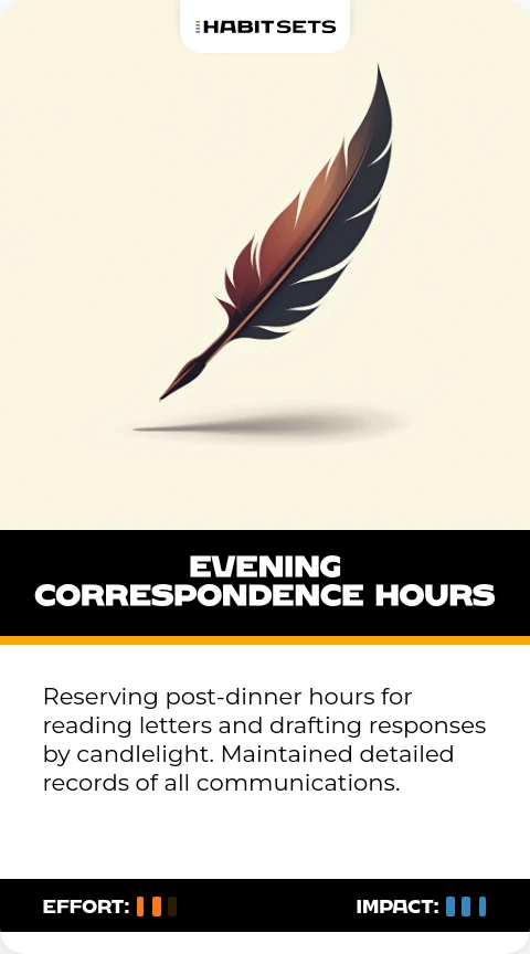 Reserving post-dinner hours for reading letters and drafting responses by candlelight. Maintained detailed records of all communications.