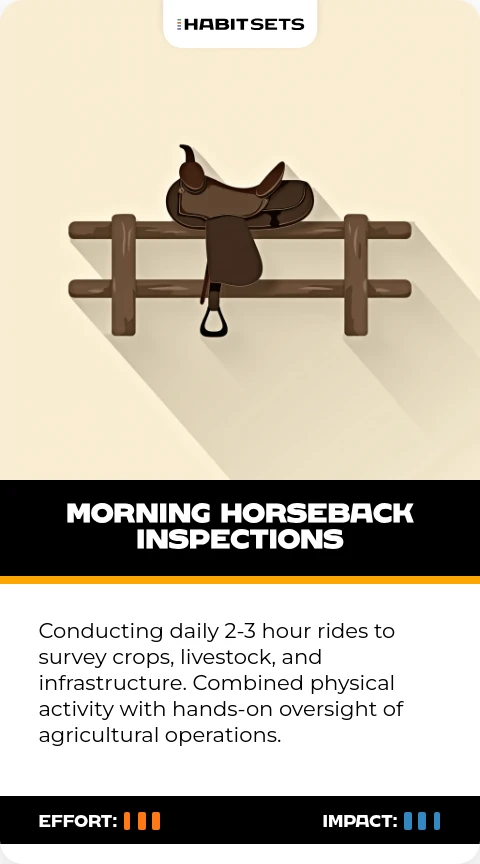 Conducting daily 2-3 hour rides to survey crops, livestock, and infrastructure. Combined physical activity with hands-on oversight of agricultural operations.