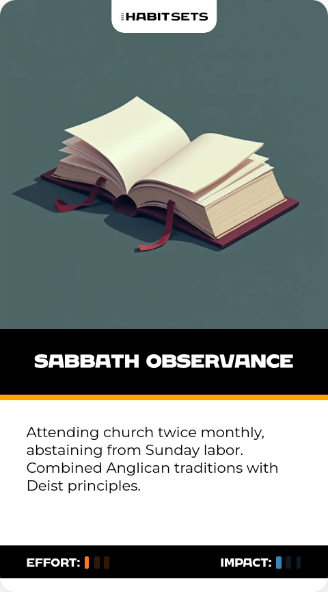 Attending church twice monthly, abstaining from Sunday labor. Combined Anglican traditions with Deist principles.